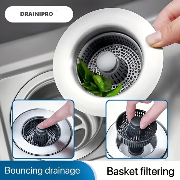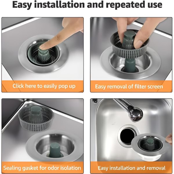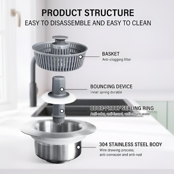 Questa soluzione all-in-one funziona come colino, tappo e filtro antiodore, per mantenere il lavandino pulito, asciutto e privo di odori.