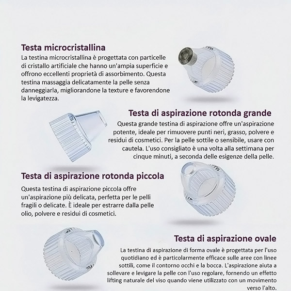 Il dispositivo è dotato di 4 accessori intercambiabili, ognuno dei quali è stato progettato per rispondere a specifiche esigenze della pelle. Per maggiori dettagli sul funzionamento di ogni accessorio, consultare il grafico sottostante!