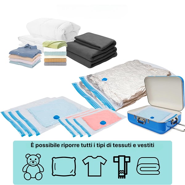 Non servono strumenti speciali—basta usare qualsiasi aspirapolvere per comprimere i sacchetti in pochi secondi! Inoltre, sono riutilizzabili, così puoi conservare e proteggere i tuoi vestiti più e più volte.